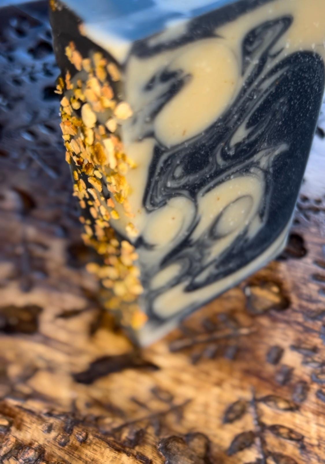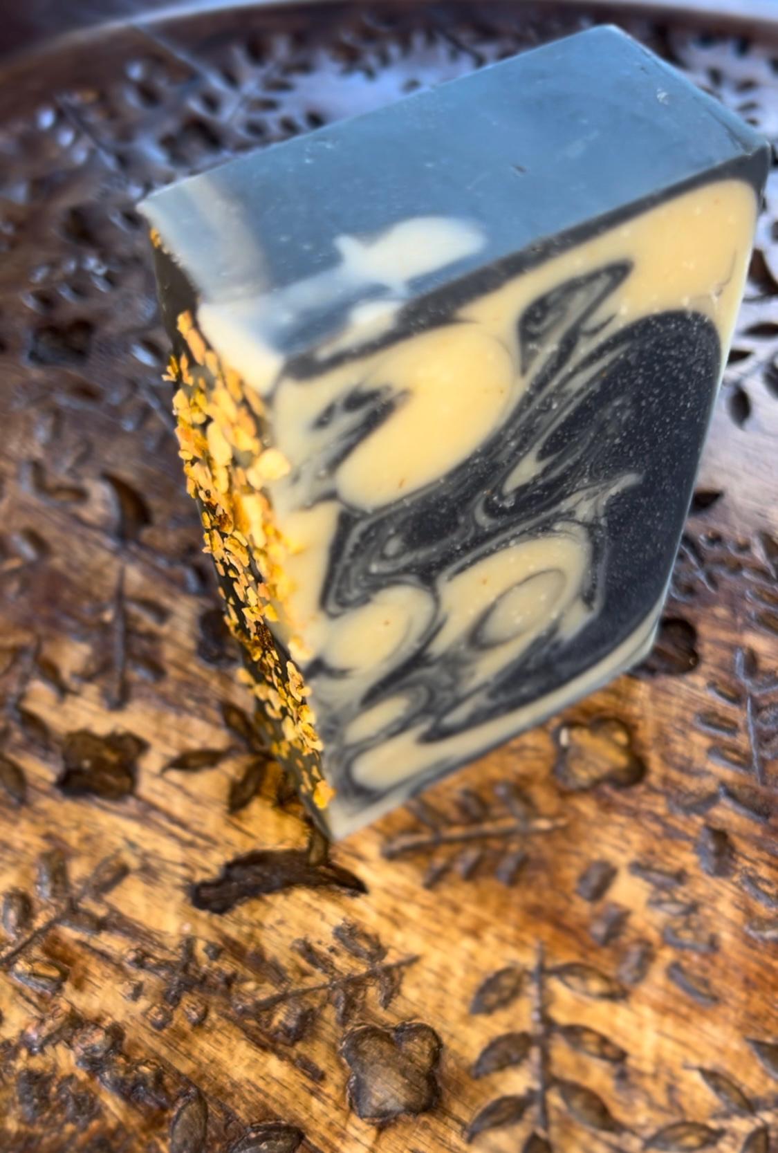 Ingredients: Saponified Oils of Olive, Coconut, Shea Butter, Kokum Butter, Castor, Cocoa Butter; Distilled Water, Activated Charcoal, Turmeric, Grated Dried Orange Peel, Zinc Oxide, Sodium Lactate, and Essential Oils: Orange, Cedarwood Atlas, and Dark Patchouli.
