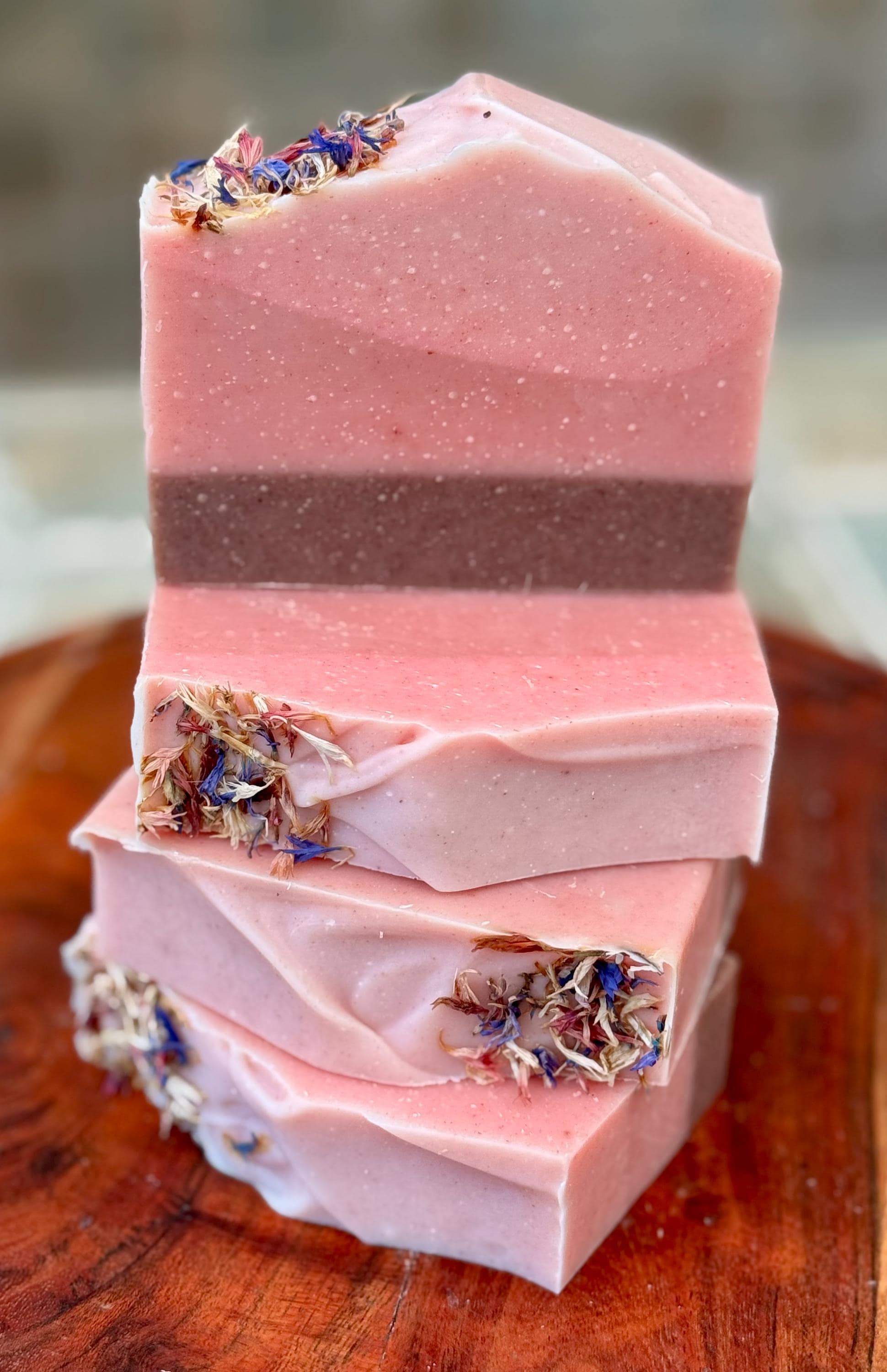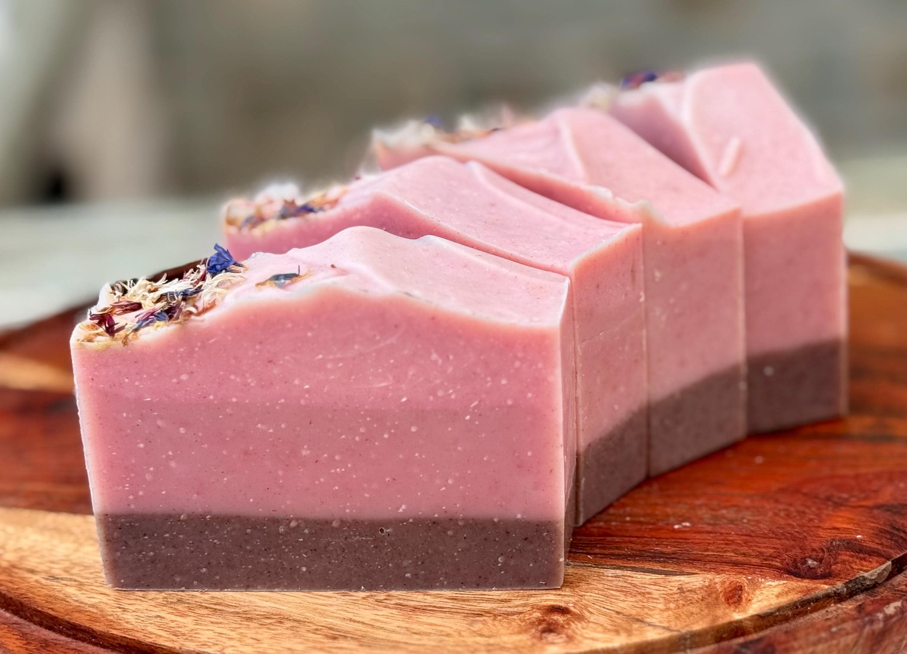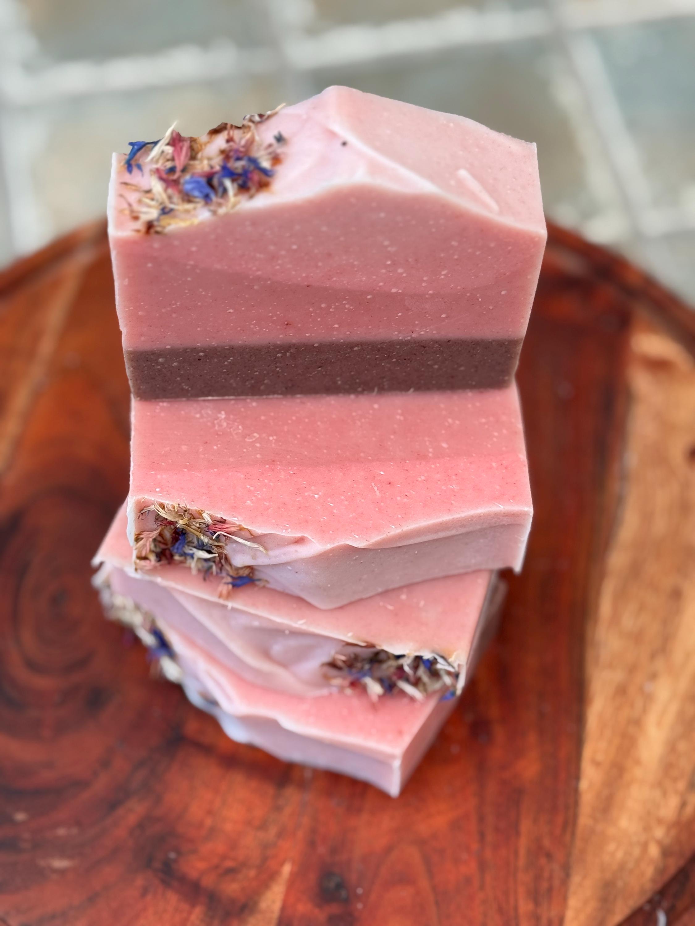 Ingredients: Saponified Oils of Olive, Coconut, Shea Butter, Kokum Butter, Castor, Cocoa Butter; Distilled Water, French Pink Clay, Madder Root Powder, Activated Charcoal, Sodium Lactate, Zinc Oxide, Citric Acid and Essential Oils: Rosemary, Lavender, and Ylang Ylang.