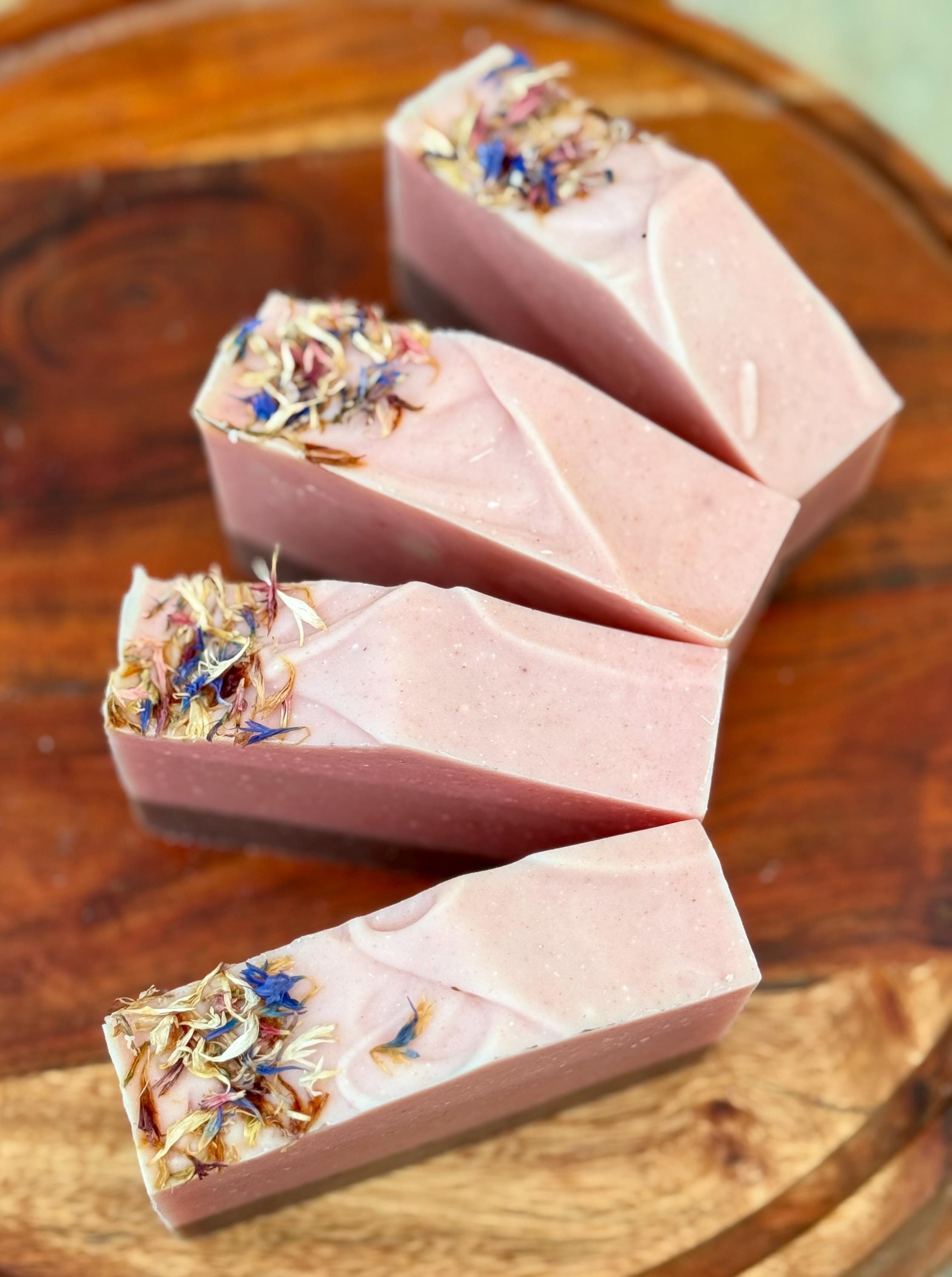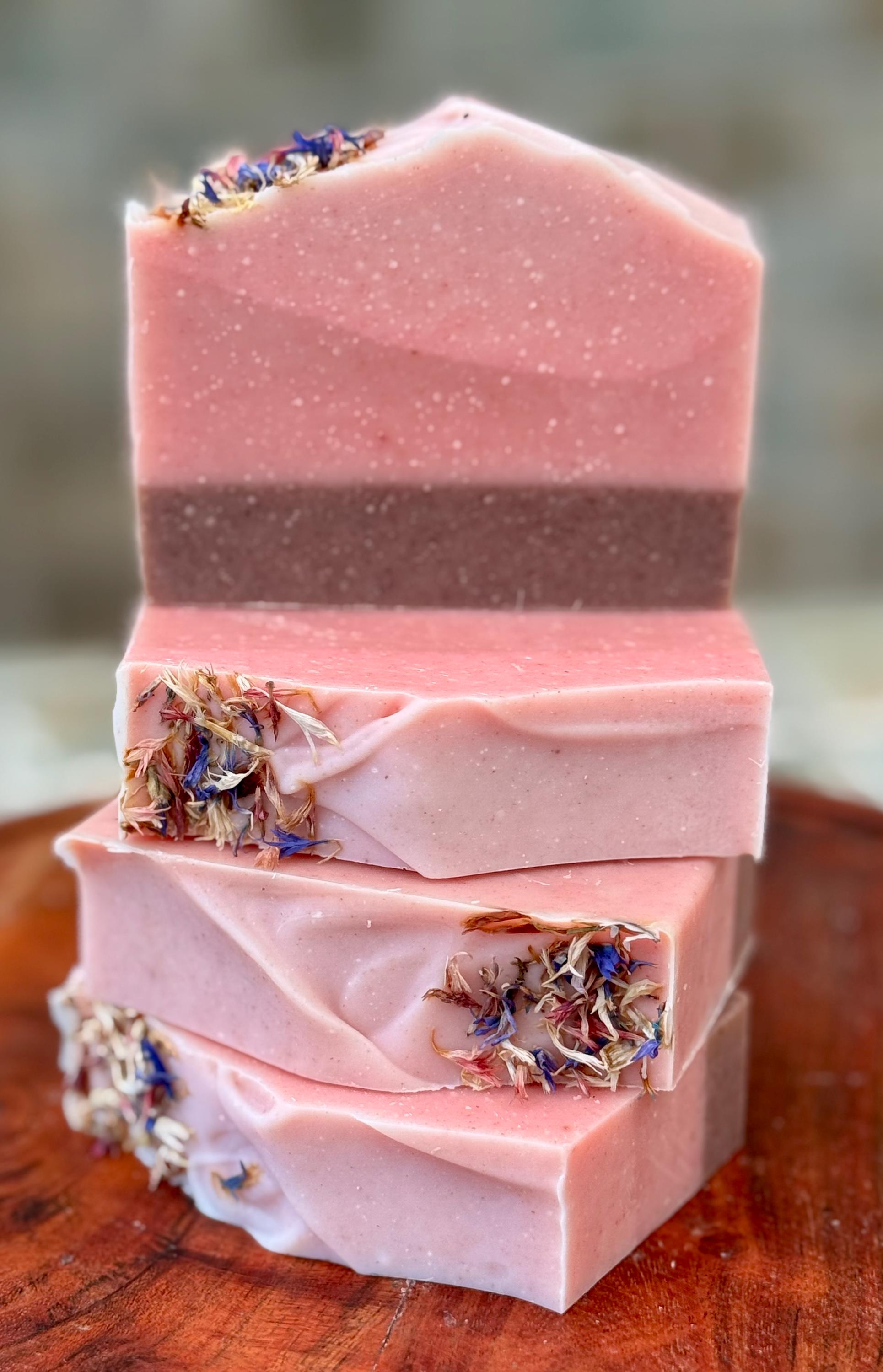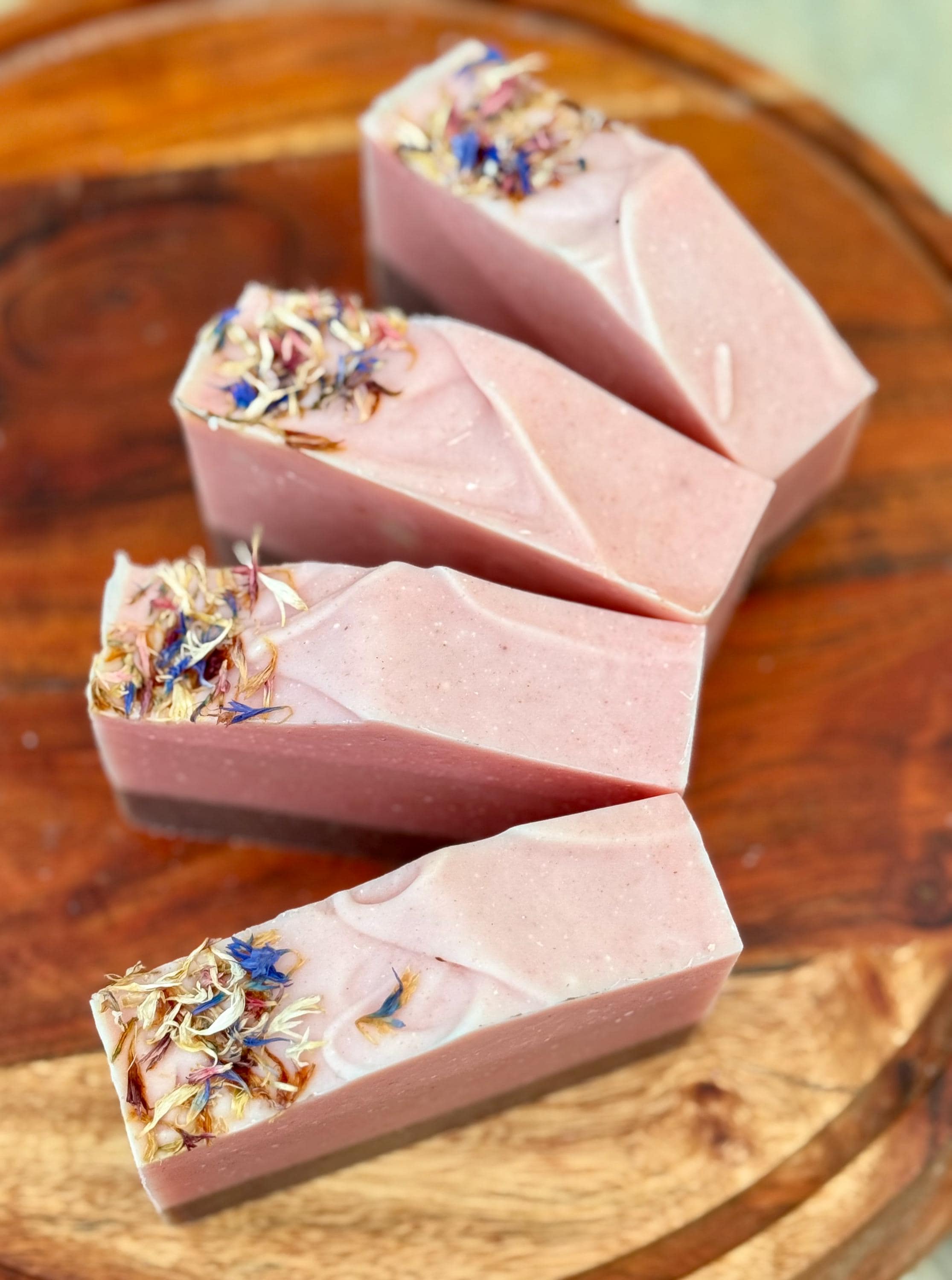 Ingredients: Saponified Oils of Olive, Coconut, Shea Butter, Kokum Butter, Castor, Cocoa Butter; Distilled Water, French Pink Clay, Madder Root Powder, Activated Charcoal, Sodium Lactate, Zinc Oxide, Citric Acid and Essential Oils: Rosemary, Lavender, and Ylang Ylang.