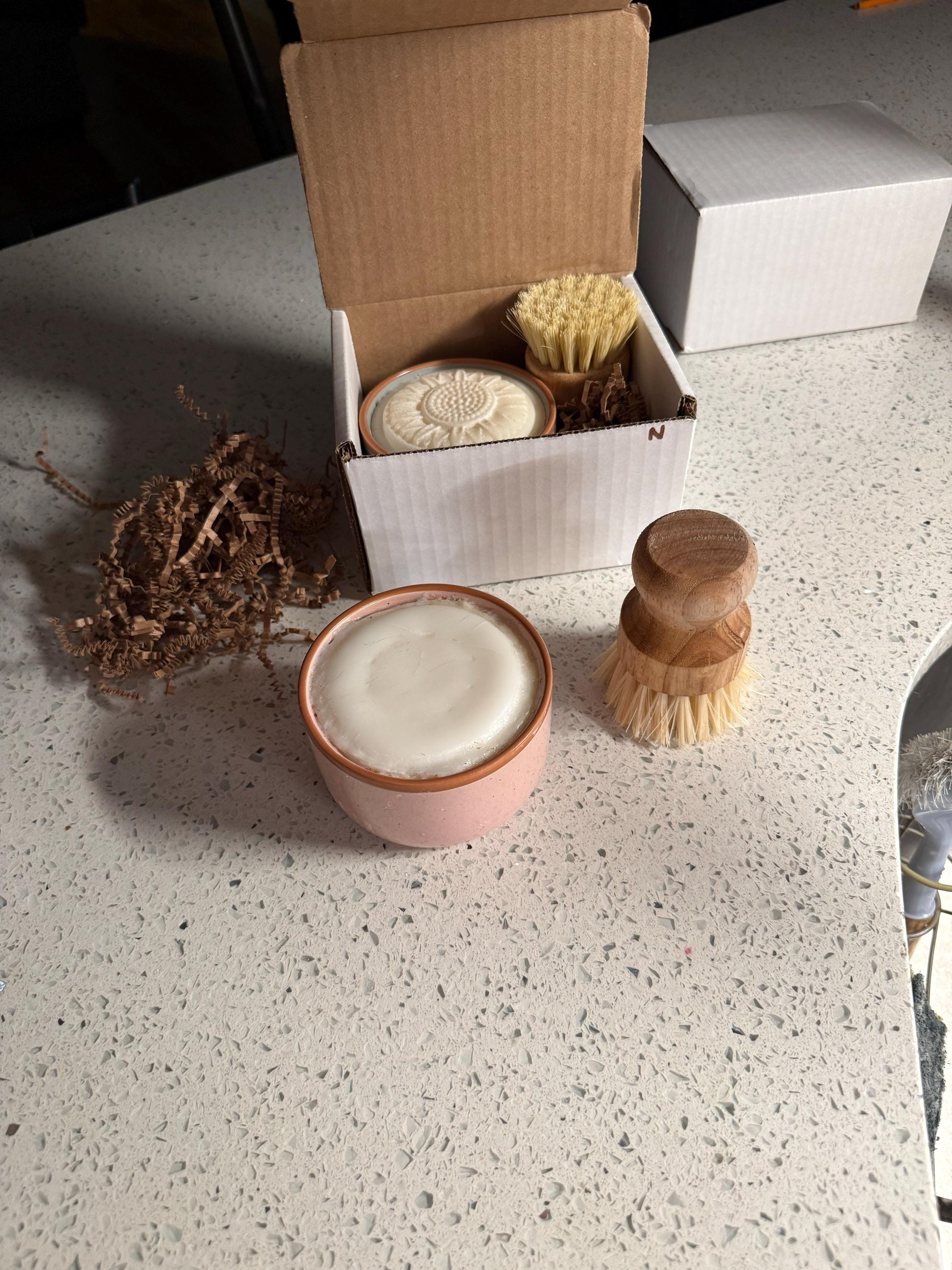 The cold processed, solid dish soap has been hand poured into a ramekin for easy use in your kitchen. Solid dish soap is a more sustainable option than liquid soap that has been diluted with water and bottled in plastic. Our soap is handmade and scented with Rosemary, Peppermint, and Spearmint essential oils. This soap washes off cleanly and doesn't leave behind a residue, unlike many store bought soaps. This product is free from colors, dyes, or fragrance oils. This is a long-lasting soap, with a minimum of 7.5 oz. Amounts do vary, with some weighing in closer to 9.5 oz.